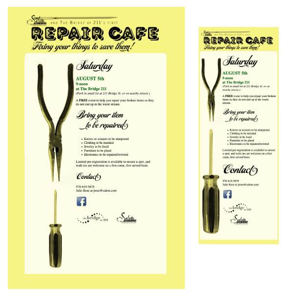 Having fun with the tools of repairing. The nose plier and screwdriver are talking to each other. At the top, the swooshy Salem Recycles logo threads through a needle. That swoosh typeface of the logo informs the headline type, creating a festive looking event.