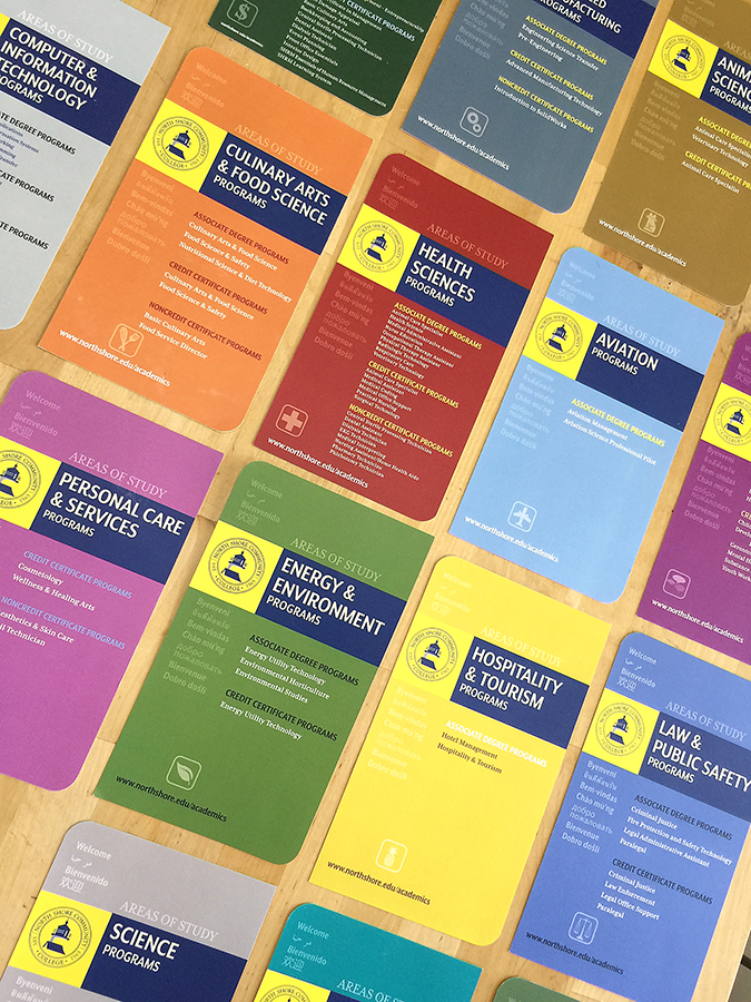 Twenty two areas of study rack cards were designed destinguished by color and a small icon. They were designed to be placed in a large card rack where the name of the program would peak above the holder.